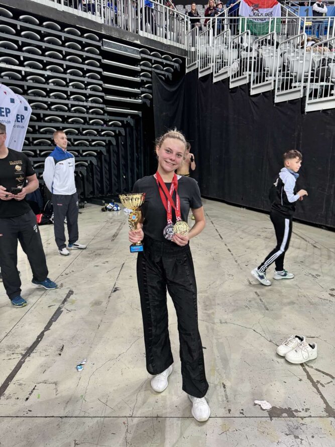 Ana Jović, učenica 3f i ove je godine uspješno započela sportsku sezonu u kickboxingu! Na europskim kupu u Zagrebu osvojila je zlato i dva srebra te se na državnom prvenstvu u Jastrebarskom okitila s dvije zlatne medalje u juniorskoj i seniorskoj konkurenciji u point fightingu. Čestitamo ti Ana! Bravooo!